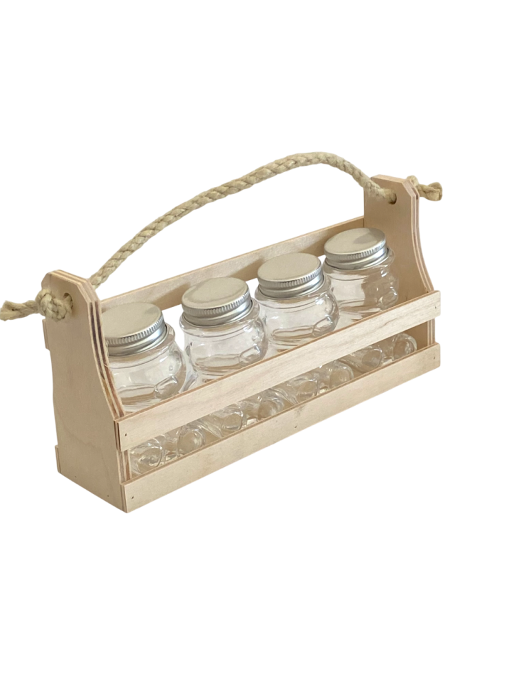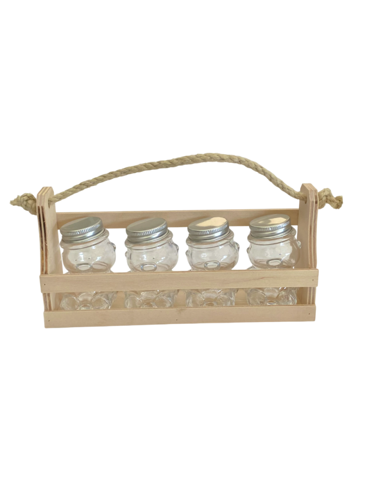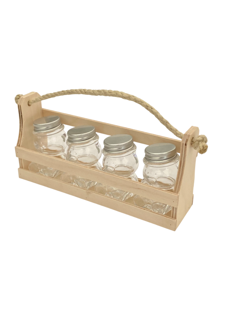 Dekoratív fa szállítóláda 4 darab MACKO5 (50 g) típusú mézes üveg számára.