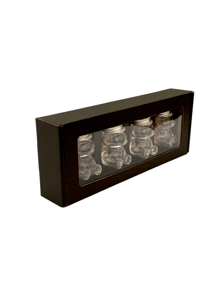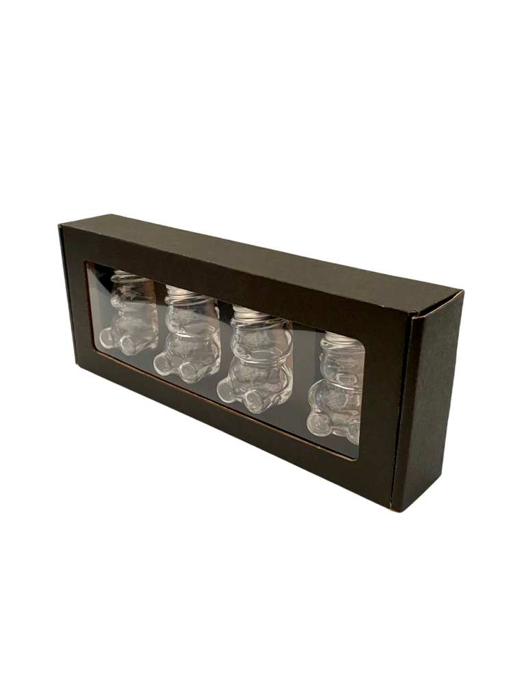 Ez a csomagolás ajándékozási vagy bemutatási célokra készült. 4 darab, 50 g-os, maci formájú mézes üveg ( MACKO5 típus) számára alkalmas.