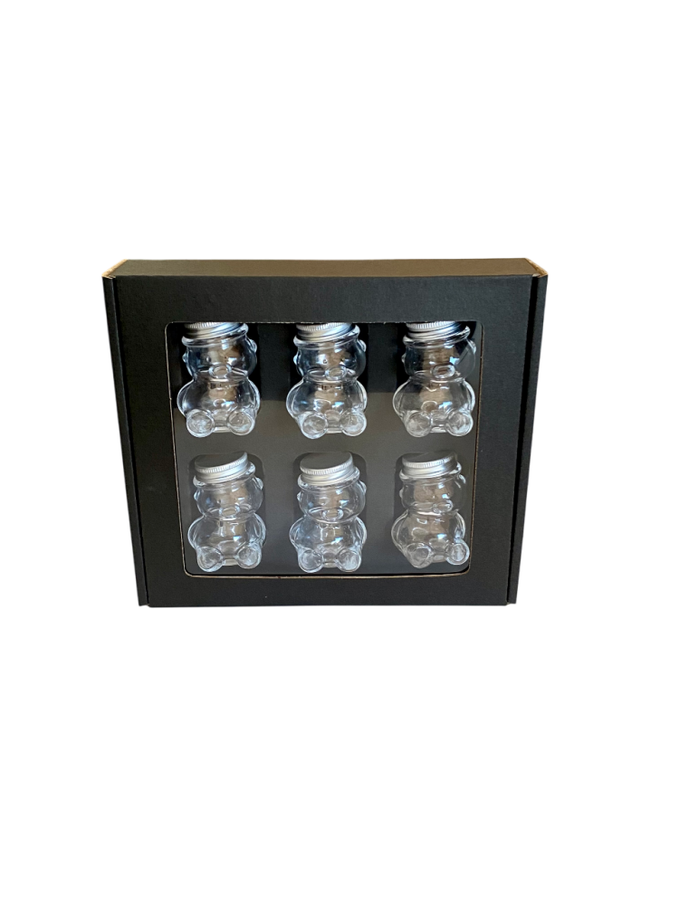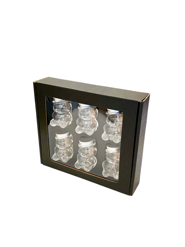 Figyelem: A csomag csak a papírból készült dobozt tartalmazza. Az üvegek (macik) és a méz nem képezik a csomag részét.
