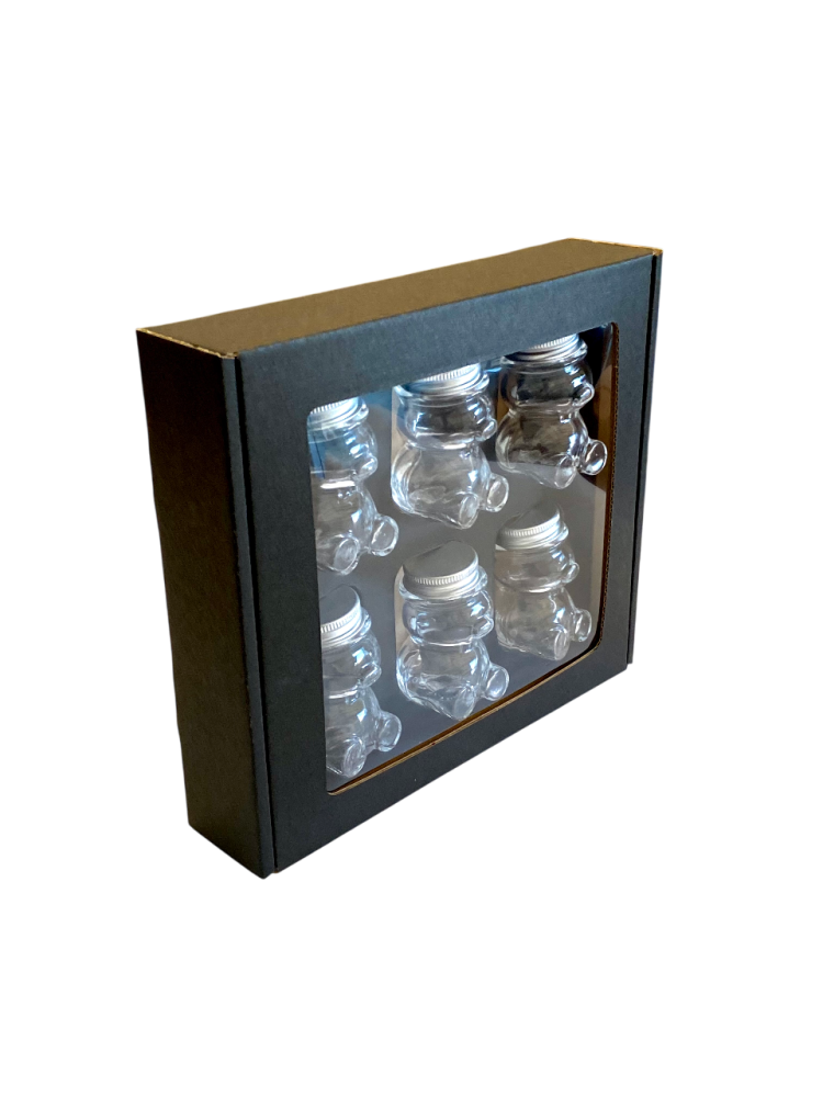 Ez a csomagolás ajándékozási vagy bemutatási célokra készült. 6 darab, 50 g-os, maci formájú mézes üveg ( MACKO5 típus) számára alkalmas.
