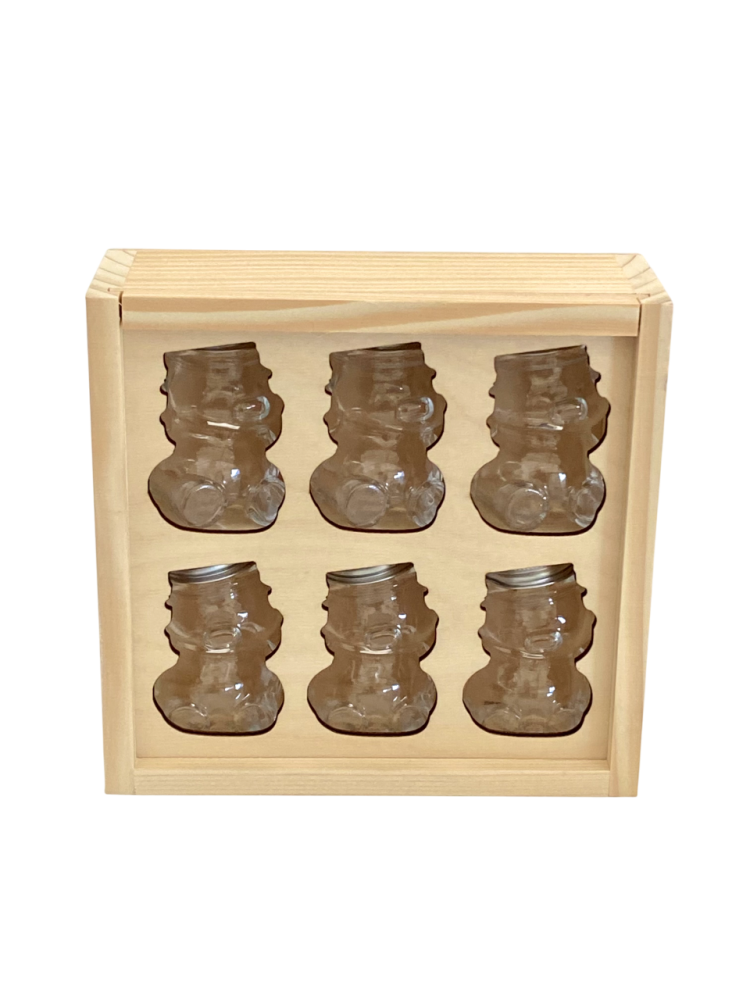 Ez a csomagolás ajándék- vagy bemutató célokra készült. 6 darab, 50 g-os, maci formájú üveg (