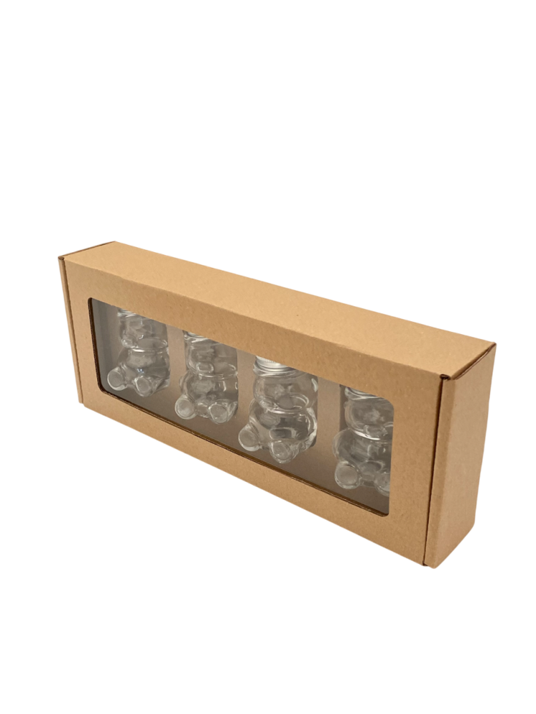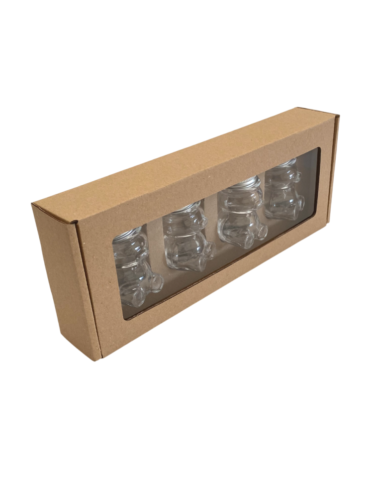 Ez a csomagolás ajándékozási vagy bemutatási célokra készült. 4 darab, 50 g-os, maci formájú mézes üveg (